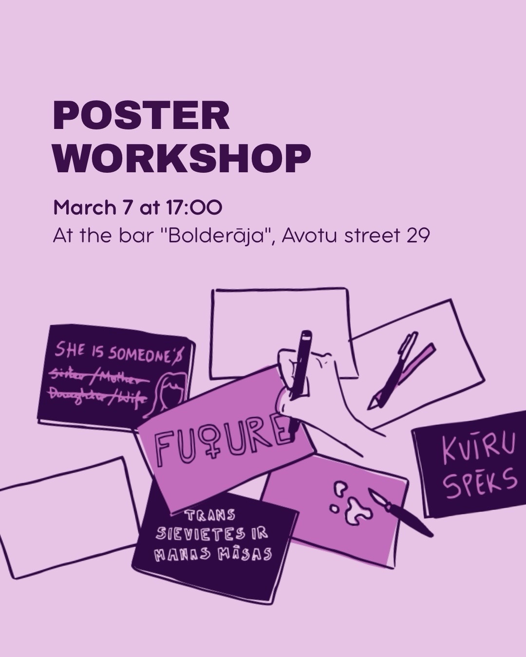 Приглашаем вас на воркшоп по созданию плакатов 7 марта с 17:00 до вечера в баре «Boderāja» , по адресу улица Авоту, 29.